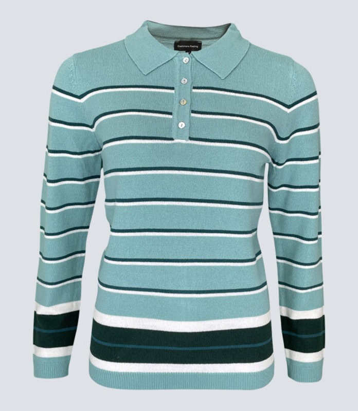 Dieser sportive Damen Polo-Pullover 18351 ist in der stilvollen Farbe Opal gehalten und in einer feinen Streifenoptik designt. Das verwendete Material hat einen wärmeren Touch und ist besonders soft und weich auf der Haut, weshalb die Serie Cashmere Feeling heißt.