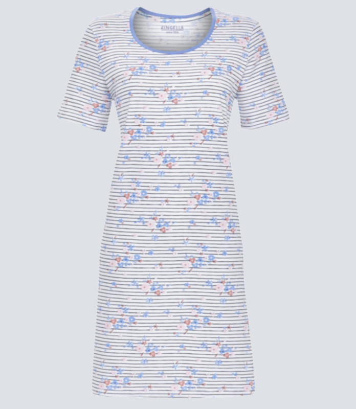 Das sportive Damen Nachthemd von Ringella ist normal geschnitten, in einer kürzeren Länge umgesetzt und mit einem guten halben Arm versehen. Der klassische Rundhalsausschnitt ist leicht in Hellblau abgesetzt und wirkt dadurch besonders frisch.