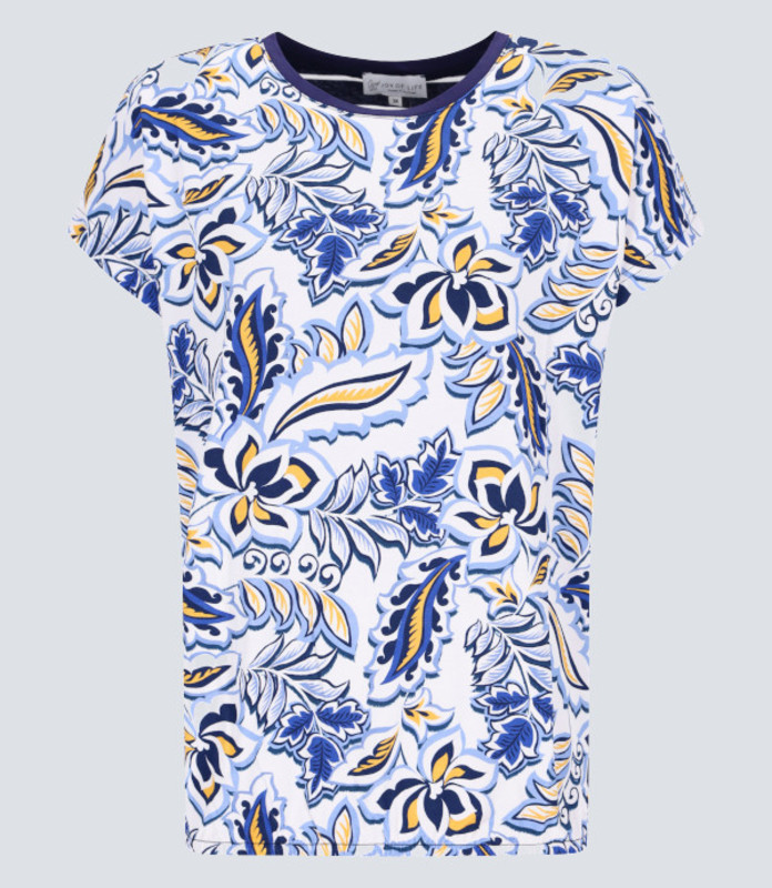 Dieses raffinierte Damen TOP 10789 überzeugt mit einem frischen Allover-Print in den Farben Tinte, Weiss und Gelb. Gefertigt wurde das Shirt aus einem elastischen Viskosemix und überzeugt mit seinem angenehmen Tragekomfort.