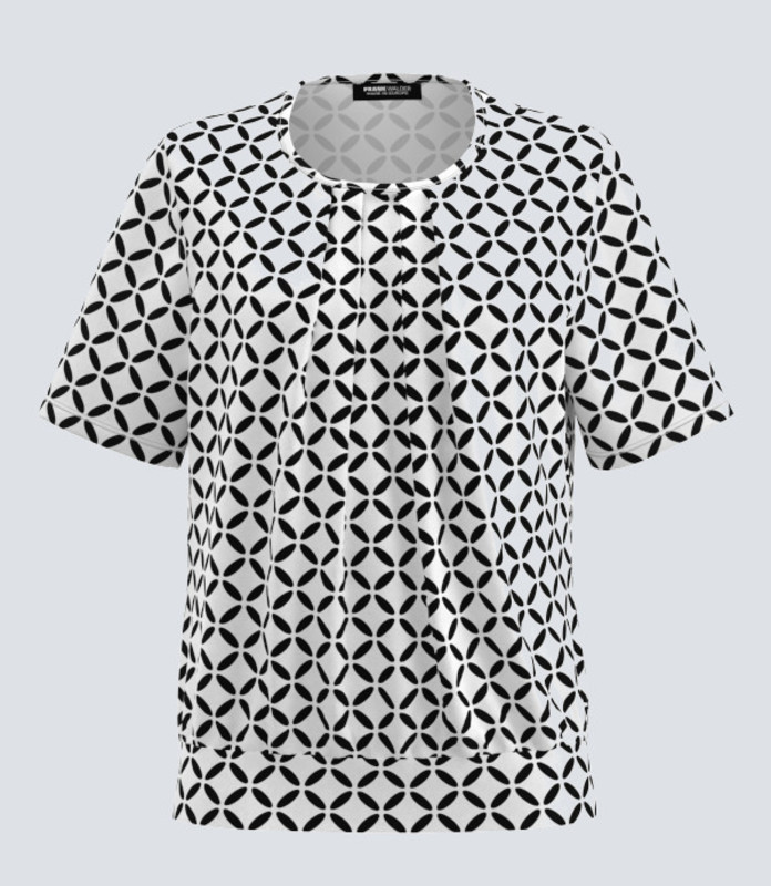 In einem geometrischen Allover-Print überzeut das stilvolle Damen Blusenshirt 715.422 in einer klassischen Farbkombination von Weiss und Schwarz. Einfach zeitlos, schick und garantiert nicht langweilig. Das verwendete Material ist ein Blusenstoff aus einem pflegeleichten Viskosemix mit Elasthan. Er schmiegt sich sanft an die Haut und bietet durch seine Elastizität Bewegungsfreiheit in jedem Moment.