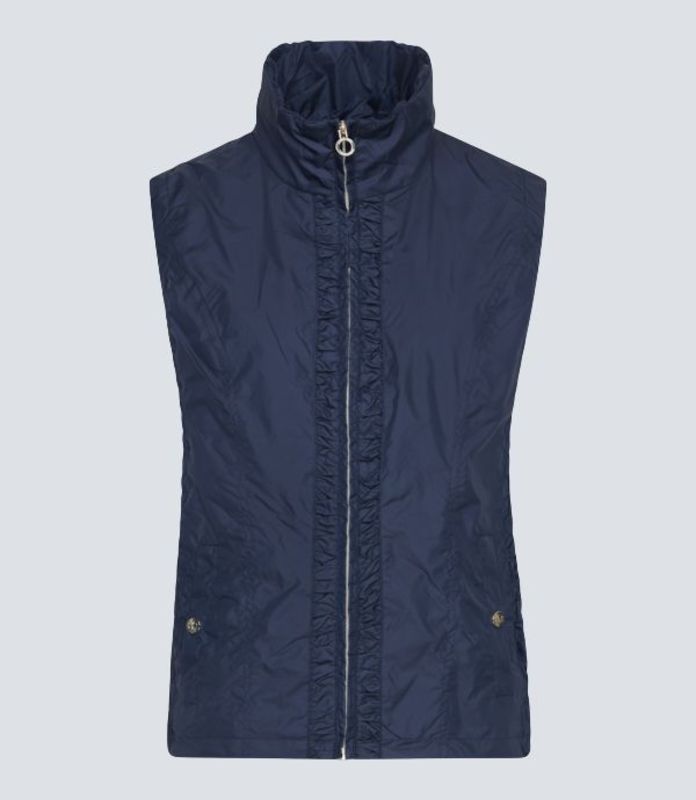 Die raffinierte Damen Weste von Navigazione präsentiert sich in einem klassischen, geraden Schnitt mit einer angenehmen Länge. Zwei praktische Taschen mit dekorativen Knöpfen verleihen der Weste eine charmante Note. Ihre Wandelbarkeit macht sie besonders vielseitig: Geschlossen wirkt sie sportlich und modern, während ein umgelegter Kragen eine elegante Nuance setzt. Feine Raffungen entlang der Reißverschlussleiste und an den Seiten runden das Design stilvoll ab und verleihen der Weste das gewisse Etwas.