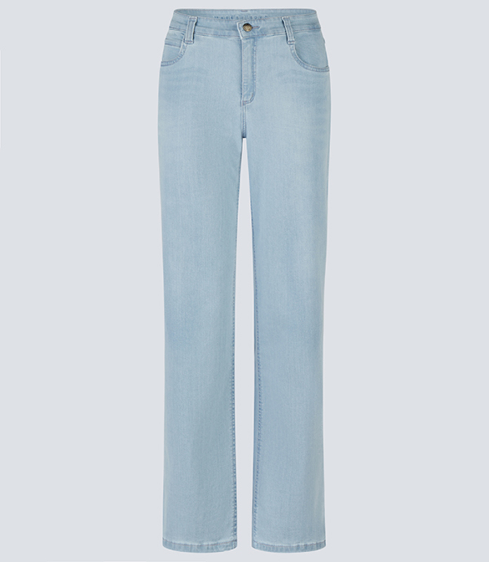 Diese komfortable Damenjeans Relaxed Straight 83335 zeigt sich in dem beliebten Denimton Sun-Blue, einem helleren Jeansblau, das großflächig leicht aufgehellt und in einer modernen Jeansstruktur gestaltet wurde. Gefertigt wurde die Relaxed Straight aus einem extrem elastischen Denim, der optimalen Komfort bietet und dabei sicher nicht die Form verliert.