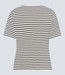 Das gestreifte Damen T-Shirt von Frank Walder ist in einer normalen Passform und in einer kürzeren Länge mit Halbarm umgesetzt. Trotz zurückhaltender Farbgebung wirkt das Shirt etwas unruhig, was man mit einfarbigen Oberteilen etwas mindern kann.