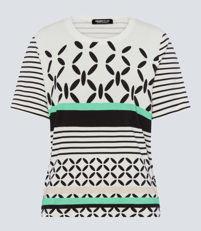 Mit einem ausgefallenen Mustermix bringt das weisse Damen T-Shirt 716.401 die Farben Grün, Schwarz und Beige harmonisch in Einklang. Die abwechslungsreiche Optik fällt zudem garantiert direkt ins Auge. Verwendet wurde ein leichter Viskosemix, der angenehm auf der Haut liegt und leicht elastisch wirkt.
