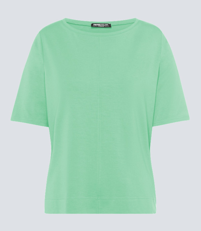 Das grüne Damen T-Shirt von Frank Walder ist in einer normalen Passform und in einer kürzeren Länge mit Halbarm umgesetzt. Seine schlichte aber moderne Optik macht es zu einer guten Wahl für Kombinationen mit gemusterten Oberteilen.