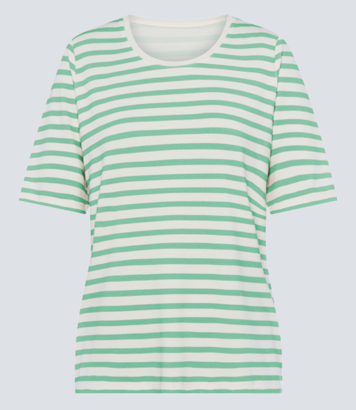 Dieses frische Damen T-Shirt 402.452 zeigt sich in einer klassischen Streifenoptik in der frischen Farbkombination Grün und Weiss. Verwendet wurde ein leichter Viskosemix, der angenehm auf der Haut liegt und leicht elastisch wirkt.