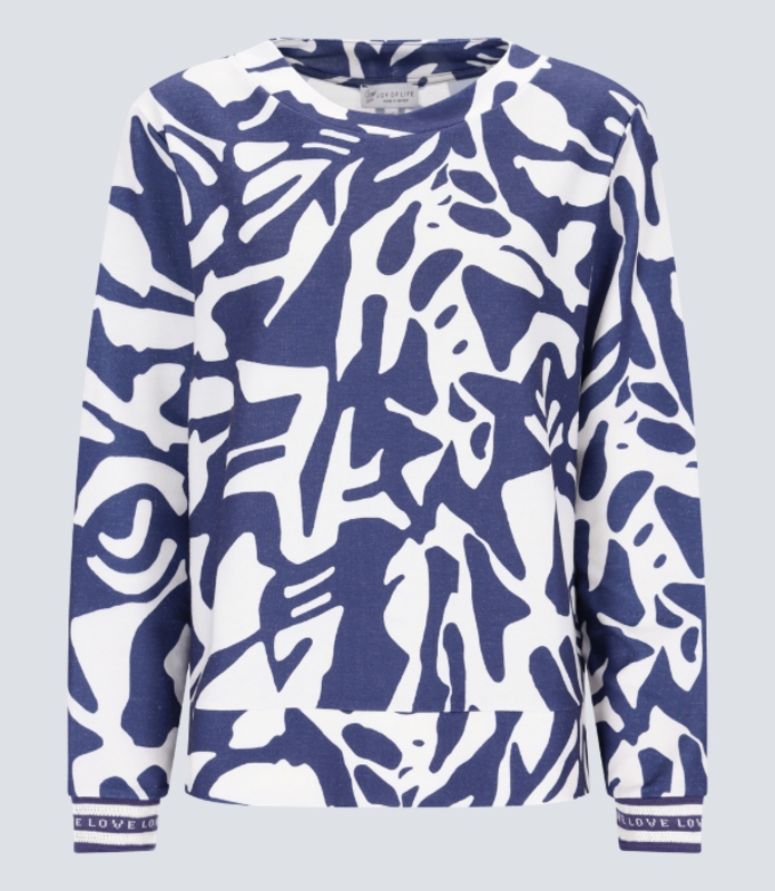 Dieses ansprechende Damen Sweatshirt 10810 zeigt sich in einem wilden Allover-Print in der abwechslungsreichen Farbe Tinte. Gefertigt wurde das Shirt aus einem soften Materialmix mit Baumwolle und überzeugt durch seinen guten Tragekomfort.