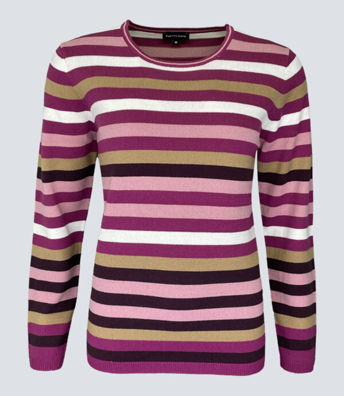 Dieser hübsche Damen Pullover 18350 zeigt sich in dem beliebten Herbstton Fuchsia und ist in einer ausdrucksstarken Streifenoptik gestaltet. Das verwendete Material hat einen wärmeren Touch und ist besonders soft und weich auf der Haut, weshalb die Serie Cashmere Feeling heißt.