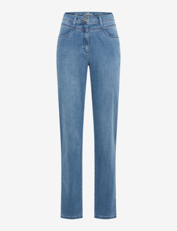 Die bequeme Jeans Caren von Raphaela by BRAX ist eher für den weiteren Oberschenkel geeignet und überzeugt als absolute Comfort-Plus Jeans. Die hohe Leibhöhe und der bequeme Bund bieten nicht nur Komfort, sondern kaschieren auch geschickt den Bauchbereich, ohne dabei zu drücken. Die Damen Comfort-Fit Jeans ist hier in Kurzgröße gestaltet.