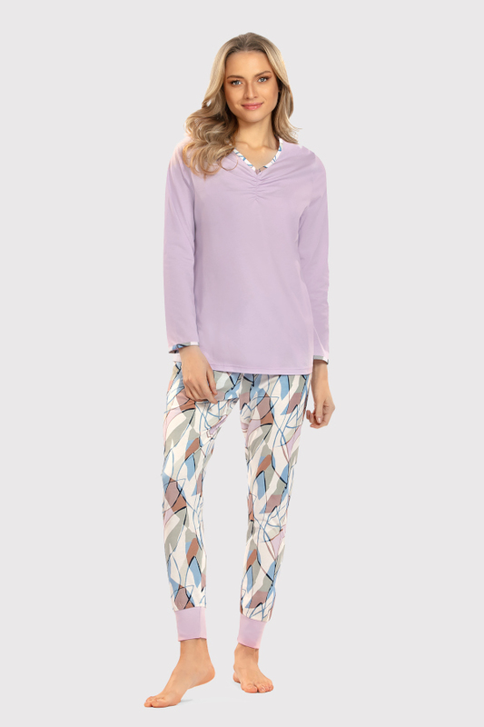 Dieser hübsche Damen Schlafanzug A2523117 zeigt sich in einer raffinierten, mehrfarbigen Musterung. Das Oberteil ist in einem zarten Flieder gefärbt. Gefertigt wurde der Schlafanzug aus reiner Baumwolle in einem Single-Jersey gefertigt, was zu einen angenehmen Tragekomfort sowie guter Atmungsaktivät führt.