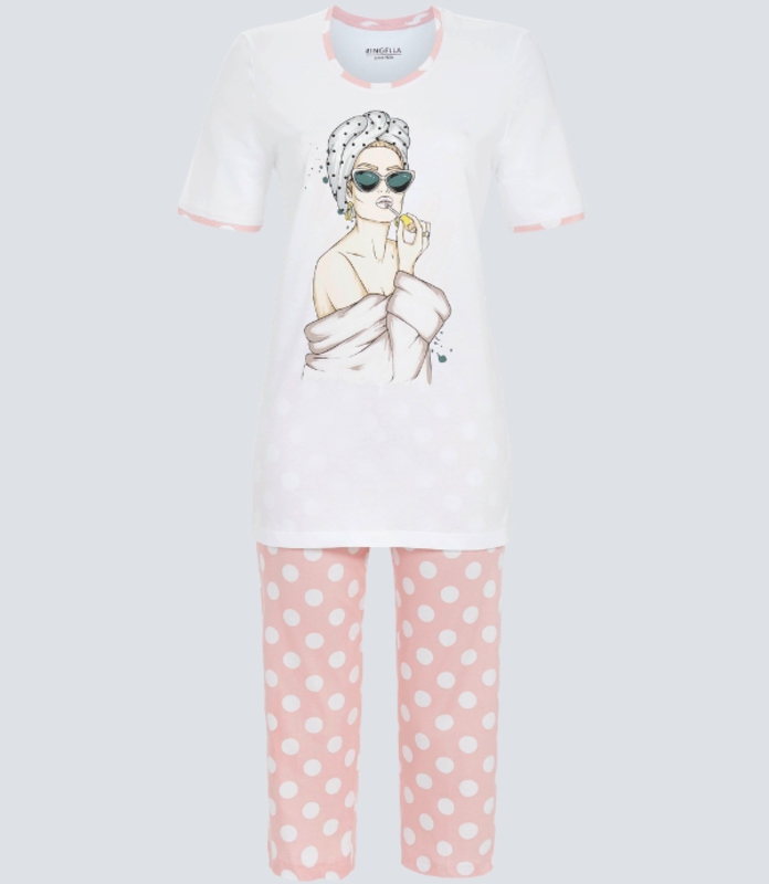 Der trendige Damen Schlafanzug von Ringella ist normal geschnitten und mit einem Halbarm versehen. Die gepunktete Caprihose bietet ein hohes Maß an Bequemlichkeit und ist vielseitig tragbar. Der bezaubernde Schlafanzug zeigt eine ausgefallene Optik und kommt vielen Damen zugute, die eine kürzere Variante suchen.