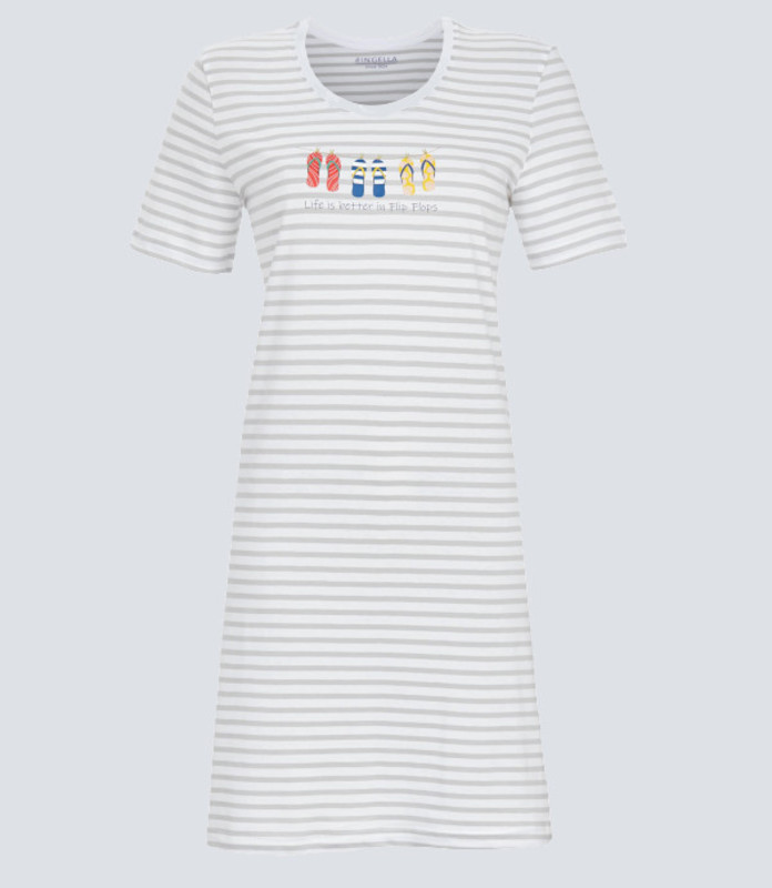 Dieses zarte Damen Nachthemd 6211044 ist in einer filigranen Streifenoptik in Silber gestaltet. Als kleine Zierde wurde es zudem mit einem farbigen Motivdruck geschmückt. Der weiche Single-Jersey aus reiner Baumwolle liegt angenehm auf der Haut und sorgt für ein rundum gutes Tragegefühl, ideal zum Entspannen und Wohlfühlen.