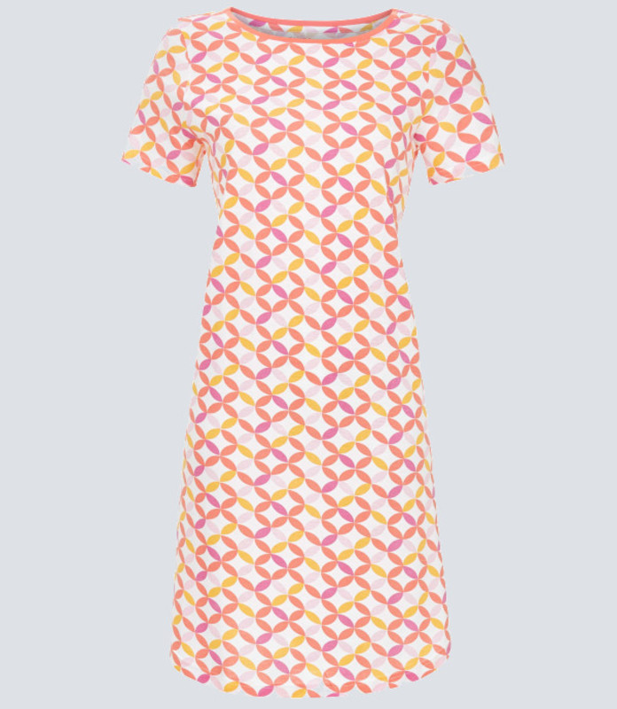 In einer auffälligen geometrischen Musterung erstrahlt das Damen Sleepshirt 6211040 in den frischen Farben Lachs und Gelb. Der angenehme Single-Jersey ist aus einem soften Baumwoll-Modalmix gefertigt und sorgt so für ein rundum gutes Tragegefühl.