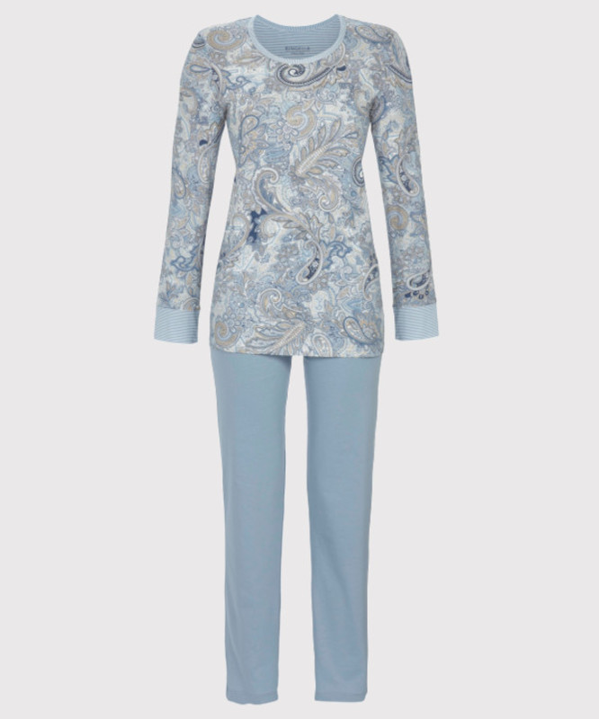 Dieser feine Damen Schlafanzug 5511238 zeigt sich in einem stilvollen Paisley-Print in der Farbe Mittelblau. Das feine Gewebe aus einem Baumwoll-Modalmix schmiegt sich an Ihre Haut an und verwöhnt Sie mit einem Gefühl von Komfort und Behaglichkeit.