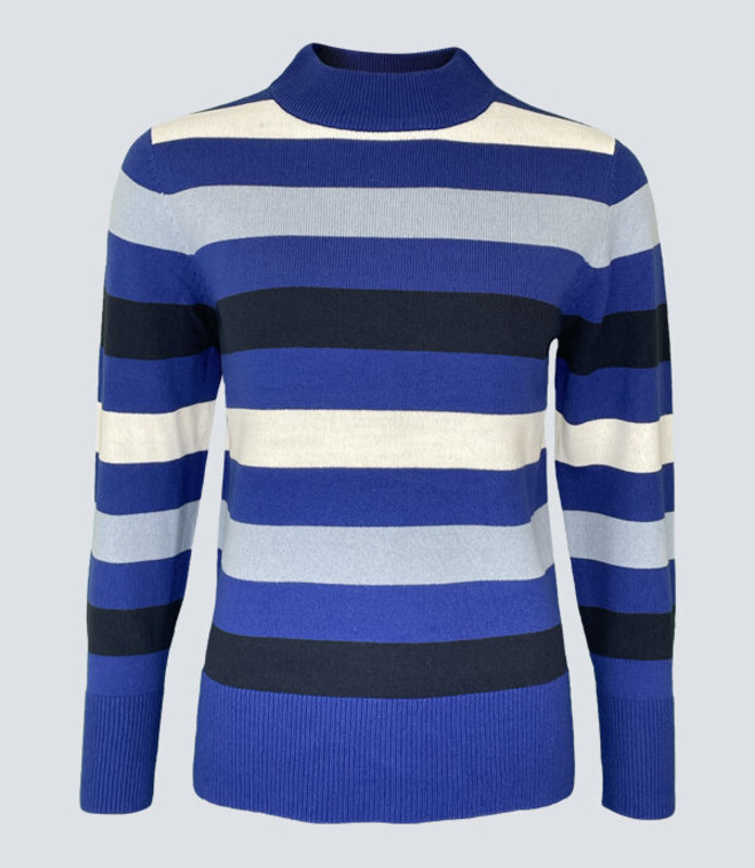 Der Damen Pullover hat eine normale Passform und eine normale Länge. Der Stehbund liegt nah am Hals an und hält den Hals schön warm. Die schöne Farbkombination der Streifenoptik lässt sich vielfältig kombinieren und erzeugt eher eine sportive Note.