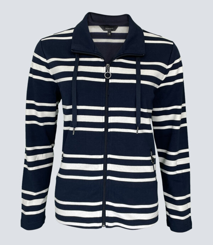 Diese sportive Damen Sweatjacke 48017 zeigt sich in einer ansprechenden Streifenoptik in den klassischen Farben Marine und Weiss. Das verwendete Material ist von mittlerer Qualität und besteht aus einem bequemen Baumwollmix für langanhaltenden Tragekomfort.