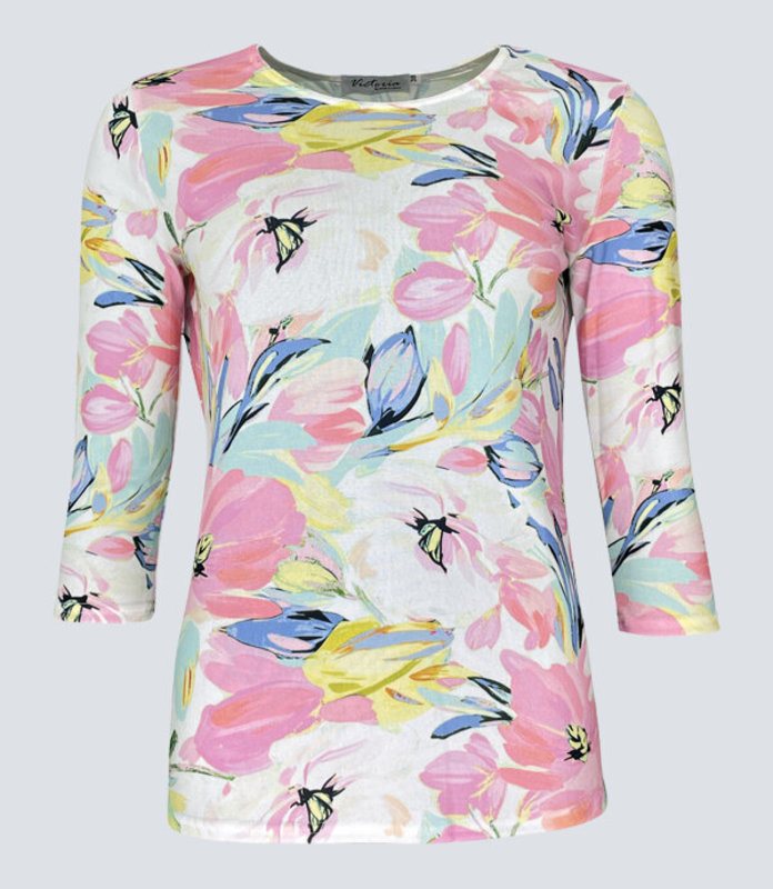 Dieser hübsche Damen Rundhalspullover 61032 zeigt sich in einem ausdrucksstarken floralen Druck. Die Musterung wird von frischen Frühjahrstönen gebildet, wobei die Hauptfarbe ein kräftiges Rosé ist. Der leichte Viskosemix sorgt für hohen Tragekomfort und macht ihn zum idealen Begleiter an milden Frühlingstagen. Vielseitig kombinierbar mit Jacken oder Westen, verleiht er jedem Outfit eine frische Note.