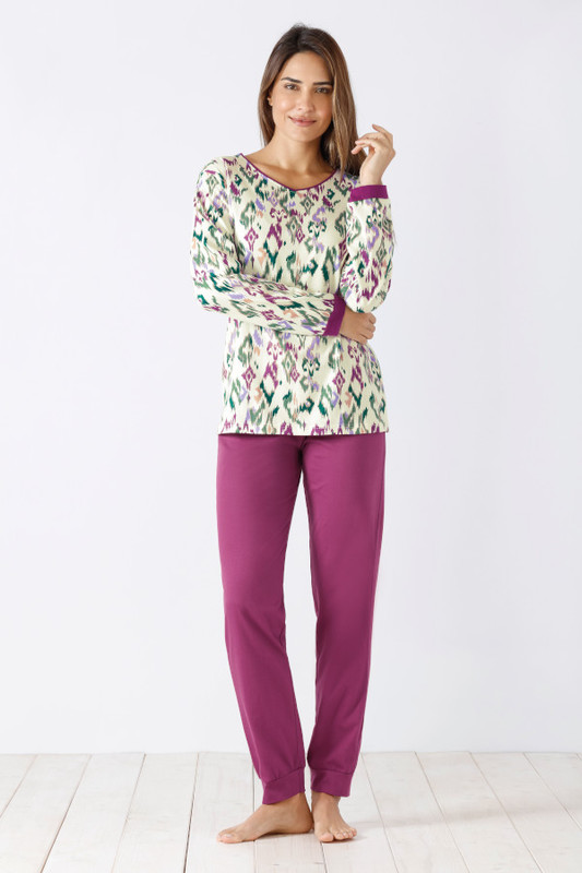 Dieser ansprechende Damen Schlafanzug 46331 zeigt sich in einer hellgrundigen Allover-Musterung, wobei die Hose einfarbig in Beere gestaltet wurde. Der Schlafanzug liegt dank des reinen Baumwollgewebes besonders angenehm auf der Haut und verspricht einen hohen Tragekomfort.