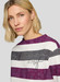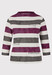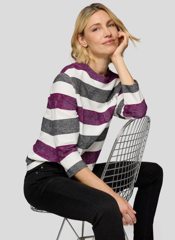 Die ansprechend sportive Optik des Damen Sweatshirt 55-122354 von Rabe ergibt sich aus einem Streifendesign mit breiten Streifen sowie einer Strassverzierung. Die hübsche Farbkombination bildet sich aus Pflaume, Natur und Graphit.