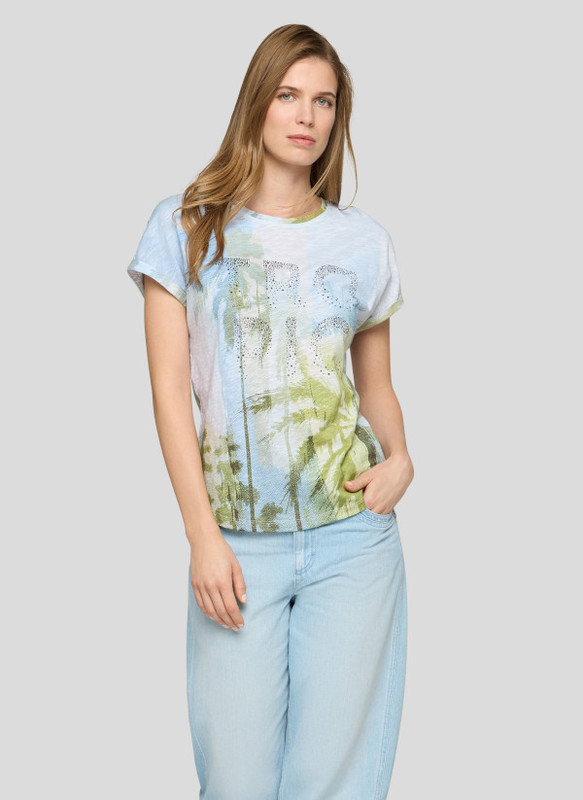 Das moderne Damen TOP von Rabe hat eine bequeme, normale Passform, in der man sich schnell rundum wohlfühlt. Neben dem frischen Print sorgt eine auffällige Strassverzierung für eine besondere Note, wobei die überschnittenen Ärmel das Bild gelungen abrunden.