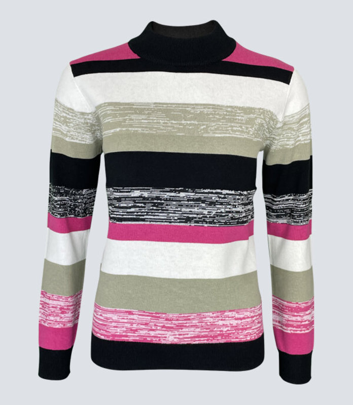 Der hübsche Damen Stehbundpullover 48331 von Navigazione zeigt sich in einer abwechslungsreichen Streifenoptik mit der Hauptfarbe Azalee. Gefertigt wurde er aus einem mittelschweren Baumwollmix, wodurch er angenehm auf der Haut liegt und einen guten Tragekomfort bietet.