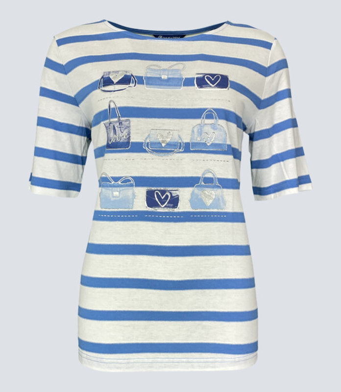 Dieses verspielte Damen T-Shirt 51025 zeigt sich in einer schönen Streifenoptik in den Farben Royal und Weiss. Der Streifenoptik vorgelagert ist ein schöner Print mit Handtaschen, der eine besondere Optik erzeugt. Gefertigt wurde das Shirt aus einem soften Baumwoll-Modalmix, der weich auf der Haut liegt und einen hohen Tragekomfort bietet.