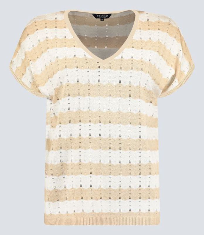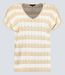 Dieser luftige Damen V-Pullover 8991 zeigt sich in einer streifenähnlichen Optik in Mandel und Weiss. Die Bündchen und der Ausschnitt sind tonig einfarbig abgesetzt. Der V-Pullover besticht durch sein lockeres Gestrick, das ihm eine leichte Erscheinung gibt. Gefertigt aus einem leichten Viskosemix, bietet er einen hohen Tragekomfort.